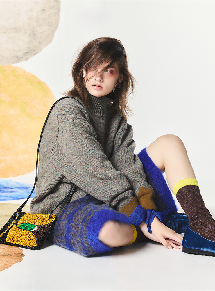 Izumi Kato’s work often explores themes of abstraction and concreteness, infused with a hint of childlike wonder and mystery. His playful forms, organic shapes, and vivid yet dark color palette inspire the ANTEPRIMA FW25 collection, which merges the abstract with the wearable to create a unique, eye-catching line for ANTEPRIMA. This inspiration translates into FW25 through imaginative designs that blur the lines between art and fashion, offering a fresh, captivating aesthetic.