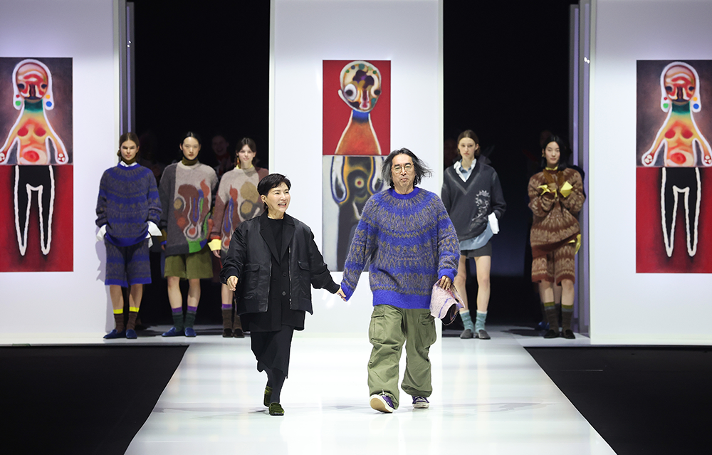 “Izumi Kato’s work carries an emotional depth — his figures seem to exist in a space between reality and imagination, with a raw yet poetic quality. What resonated with me most was the organic, almost instinctual way he builds forms, the blurred edges, and the layered textures that create a sense of movement. I wanted to capture that in the collection, translating his brushwork into fabric manipulations, embroidery, and silhouettes that feel both fluid and sculptural.” — ANTEPRIMA Creative Director Izumi Ogino
